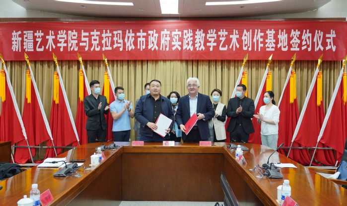 莫合德尔·亚森院长一行赴克拉玛依市与克拉玛依市市委领导班子及克拉玛依市市委宣传部、文联、文体旅游局、歌舞团、文化馆等相关部门领导围绕挖掘传承克拉玛依红色文化、校地资源优势互补、培养高素质文化艺术人才、毕业生就业等进行了交流,与克拉玛依市委常委、宣传部部长周小三签订文化艺术交流合作框架协议,并共同为新疆艺术学院(克拉玛依市)实践教学与艺术创作基地揭牌。
