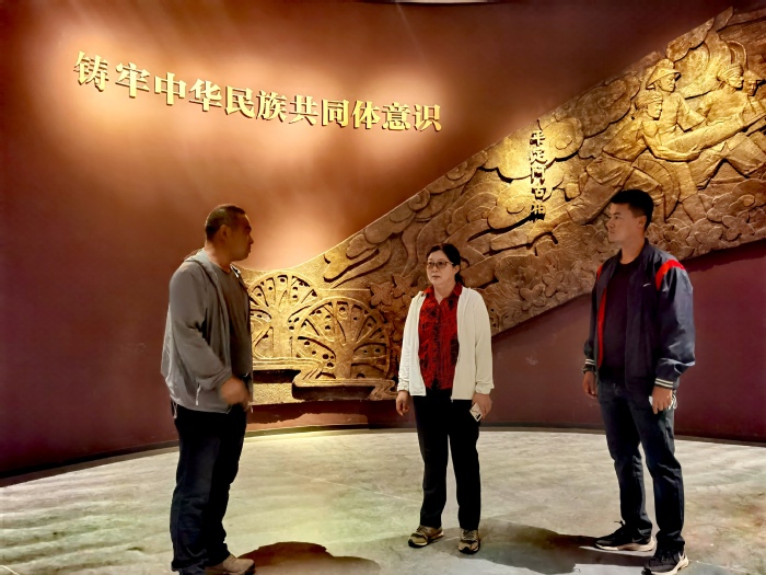 学校党委常委、组织(人事)部部长、学校驻岳普湖县阿其克乡“访惠聚”工作队总领队蒋方珍在达瓦昆沙漠旅游风景区卫国影像厅与景区负责人交流