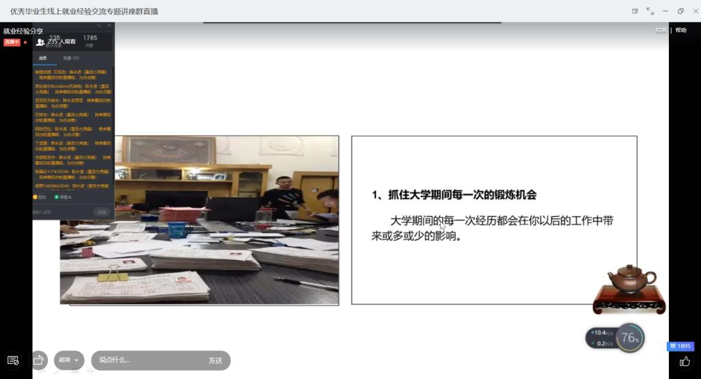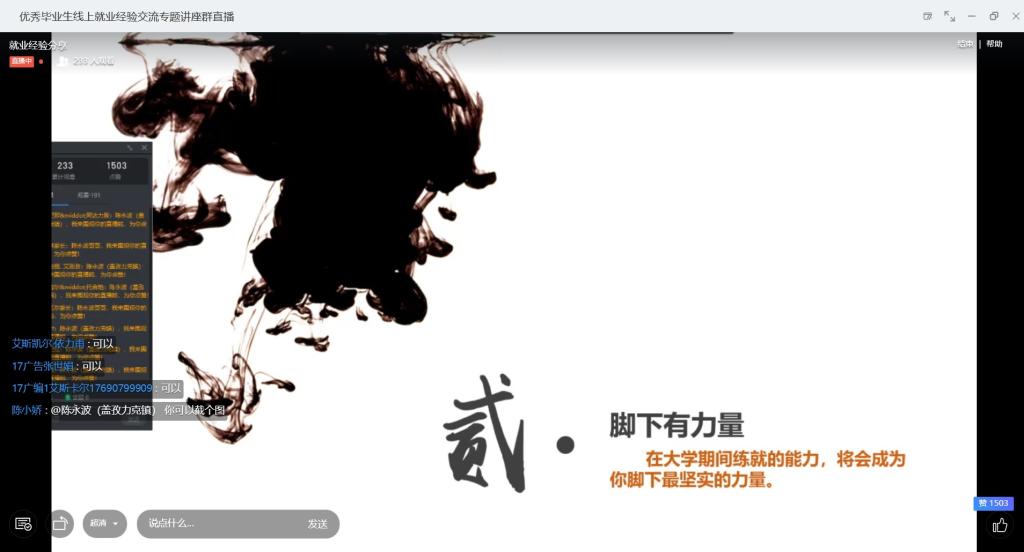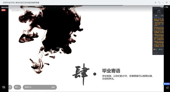 此次线上优秀毕业生经验交流专题讲座历时一小时,有305名2021届毕业生观看了此次线上交流直播,广大毕业生们纷纷表示深受鼓舞,并在线上交流时为陈永波同学点赞,线上点赞数超过3100次。