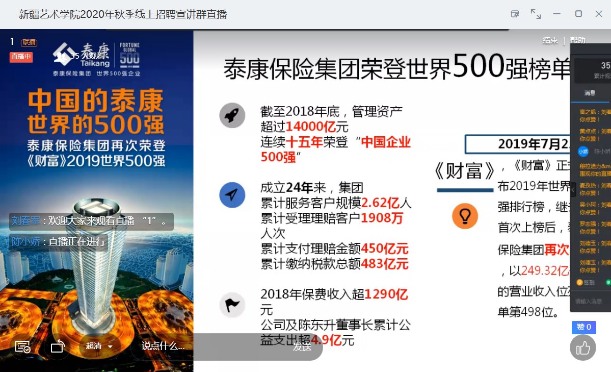 为深入贯彻落实习近平总书记关于做好新冠肺炎疫情防控和经济社会发展的重要指示精神及学校党委关于就业工作的部署与安排,持续服务毕业生需求,助力毕业生就业,9月11日下午,学校顺利开展2020年秋季首场用人单位线上宣讲会。此次参会的用人单位为泰康养老新疆分公司、恒大地产集团新疆公司。
